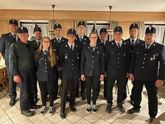 hinten links: 2. Vorsitzender Richard Miller, 2. Kommandant Andreas Schlayer, Wilfried Moser, Adrian Riefler, Reinhard Ledermann, Robert Ledermann vorne links: KBI Georg Trautwein, Lena Ledermann, Gruppenführer Sebastian Kögel, Julia Ledermann, Florian Ledermann, Kommandant Hubert Zingerle