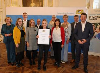 Auf dem Foto v. l.: Regierungspräsidentin Barbara Schretter, Beate Hilbig, Volker Schneider, Johanna Stedele, Thomas Fluhr, Edith Bier, Doris Mayer, Beata Wanagiel, Dr. Brigitte Schall (alle Mitwirkende beim Treffpunkt teapoint), Bürgermeister Robert Pöschl, Staatssekretär im Bayerischen Staatsministerium des Innern, für Sport und Integration, Sandro Kirchner