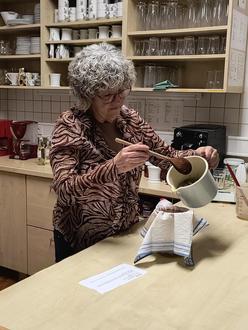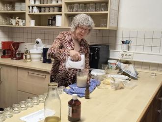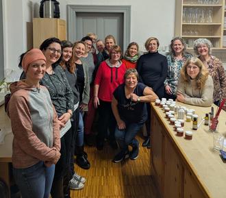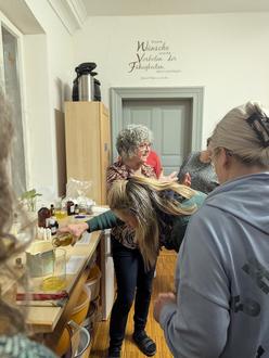 Nach einer kurzen Einweisung starteten die Kursteilnehmerinnen gleich mit dem praktischen Teil, der Herstellung eines Mazerates (Kaltauszuges), der dann später für die Fertigstellung der Fichten- bzw. Beinwellsalbe benötigt wurde. Während das Mazerat zur gewünschten Temperatur abkühlte folgte sodann der theoretische Teil. Ausführlich wurde den Workshopteilnehmerinnen Wissen über die verschiedenen im Handel verfügbaren Öle, Wachse und Fette vermittelt um bei der Herstellung der eigenen Naturkosmetik bei den einzelnen Komponenten jeweils die richtige Wahl zu treffen. Im Anschluss wurde dann in der Kräuterküche das Mazerat weiterverarbeitet zur Fichten- bzw. Beinwellsalbe und auch eine Lavendelcreme sowie ein Lippenpflegestift mit Melisse wurden hergestellt.