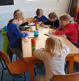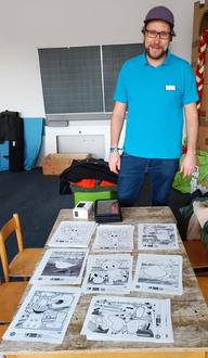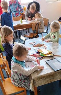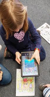 Jedes Kind durfte zunächst selbst aktiv werden und eines der ausgelegten Arbeitsblätter anmalen. Dann kamen die mitgebrachten Tablets von Herrn Koch zum Einsatz. Nach dem Scannen des QR Codes wurden mit Anwendung der „Quiver app“ die ausgemalten Figuren in Bewegung gesetzt und zum Laufen, Tanzen, Fliegen gebracht. Alle Teilnehmer konnten so unter anleitender Hilfe von Herrn Koch die Technik entdecken und ausprobieren. Nicht nur die Kinder staunten, sondern auch die Erwachsenen!
