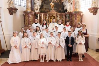 Am Samstag, den 13. April 2024 versammelten sich bei strahlendem Sonnenschein 15 Erstkommunionkinder mit ihren Eltern und Geschwister vor der St. Michaelskirche zum Kirchenzug. Unter den Klängen des Musikverein Germaringen und den Einsatz der Freiwilligen Feuerwehr zogen Sie durch die Straßen in die festlich geschmückte Kirche St. Wendelin.