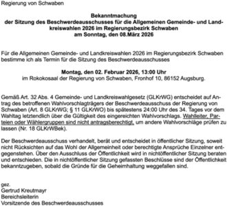 Für die Allgemeinen Gemeinde- und Landkreiswahlen 2026 im Regierungsbezirk Schwaben bestimme ich als Termin für die Sitzung des Beschwerdeausschusses