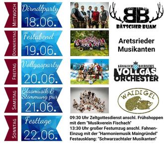 Karten für die Bands am Mittwoch und am Freitag gibt es an der Abendkasse oder über Eventim. An allen anderen Tagen „Eintritt frei“. Einlass am Mittwoch 18.30Uhr und am Freitag um 18.00 Uhr. Am Donnerstagabend ab 17.30 Totengedenken am Bahnhof mit anschließendem Bieranstich durch unseren Schirmherrn Bürgermeister Jürgen Mögele und Festabend. Samstagabend Zeltöffnung ab 18 Uhr. Eintritt frei. Sonntag ab 8 Uhr Weißwurstfrühstück anschließend Festgottesdienst und ab 13.30 großer Festumzug und Festausklang. Hier bitten wir die Anwohner für den Festumzug doch bitte die Straßen zu reinigen.