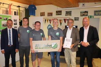 Landrat Martin Sailer (r.), Bürgermeister Jürgen Mögele und Vorsitzender Alexander Müller ehrten im Rahmen des Ehrungsabends Tobias Zaha, Christian Eller und Anton Schmid (v.l.) für ihr außergewöhnliches Engagement für den SSV Margertshausen.