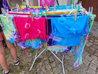 Nach der Besichtigung gingen wir zurück in die Werkstatt, dort hatte Betreuerin Anja alles für uns hergerichtet. Sie erklärte uns die drei Arbeitsmöglichkeiten zu Batiken. Währenddessen füllte Betreuerin Roswitha noch die Farben auf. Wir bekamen noch je einen Turnbeutel und einen Kissenbezug zum Batiken geschenkt, die T-Shirts, dafür hatte jeder selbst mitgebracht. Am Ende trocknete alles auf der Wäscheleine.