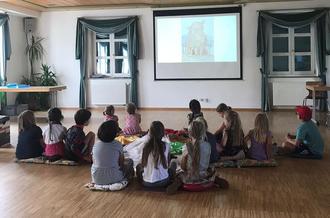 Als Erstes haben wir uns mit unseren Kissen in die Mitte gehockt. Uns wurde dann ein Buch vorgelesen, das hieß „Olis Abenteuer“, das aus zwei Geschichten bestand.