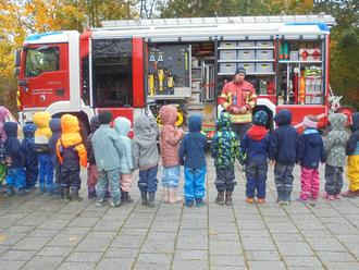 In den einzelnen Kindergartengruppen wurde eine Woche lang besprochen, wie man sich bei einem Brand verhält, wie die Feuerwehr gerufen werden kann und welche Aufgaben die Feuerwehr zu erfüllen hat.