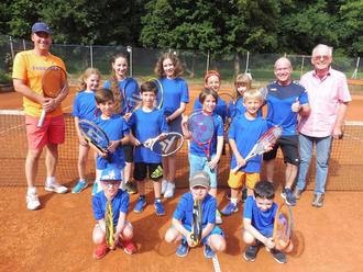 So gelang es mit Unterstützung von Tennislehrer Olli Kley, dass aus diesen Schnupperkursen 12 Kinder dem Verein beigetreten sind. Dies ist in diesen Umfang ein absolutes Novum. Um diese Zusammengehörigkeit auch nach außen hin zu dokumentieren erhielten alle Kinder neue T-Shirts. Der Förderkreis Sport im SVG ließ es sich nicht nehmen, die Aktion mit einem Zuschuss zu unterstützen. Es bleibt zu wünschen, dass die Kinder mit der bisher gezeigten Begeisterung der Abteilung neue Impulse geben.