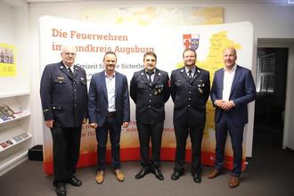 Auf dem Bild v. links: Kreisbrandinspektor Thomas Reichel, Bürgermeister Gessertshausen Jürgen Mögele, Manfred Dietmayer, Frank Baier, Landrat Peter Sailer
