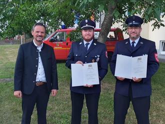 Zweien davon wurde auch vor Ort eine besondere Ehre zu Teil, denn sie erhielten die staatliche Ehrung für 25 Jahre bzw. 40 Jahre aktiven Feuerwehrdienst.