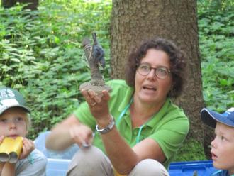 Deshalb wurden wir am 19. Juli 2023 von Frau Rieger vom Naturparkhaus Oberschönenfeld eingeladen, uns mit ihr beim „Bienenhaus“, schräg gegenüber den Hühnern zu treffen, damit wir über das Thema „heimische Singvögel“ etwas lernen können.