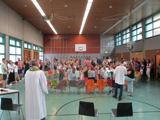 Im Kindergarten fand am 25.07.23 der Abschlussgottesdienst mit den Maxi-Kindern, deren Eltern sowie Herrn Pfarrer Putz und den Erziehern auf Grund des schlechten Wetters in der Schulturnhalle statt. Anschließend ließ jede Gruppe das Fest mit vielen Geschenke und Fingerfood, mitgebracht von den Eltern, ausklingen.