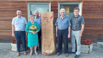Im Bild die beiden Hauptdarsteller des Abends Marianne Hefele (2. von links) und Max Hefele (2. von rechts) sowie von links: Bürgermeister Mögele, Max Strehle, Vorstand Helmut Müller. Das abgebildete Abschiedsgeschenk der Gemeinde Gessertshausen ziert nun seit dem 14.07. den Hauseingang der Familie Hefele.