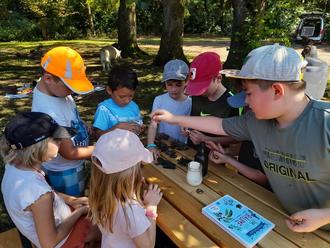 Mit der Frage: „Kennst du Waldtiere oder bist sogar schon mal einem begegnet?“ ging es los. Anschließend wurden wir in Zweiergruppen eingeteilt und durften auf Waldtiersuche gehen. Tausendfüßler, Spinnen, Graßhüpfer u.v.m. wurden in einem Lupenbecher genau unter die Lupe genommen. Wer sich nicht ganz sicher war, was er eingefangen hatte, konnte in einem der Bücher nachsehen. Danach gings für die Tiere wieder in die freie Natur. Wer hat sich sein Tier gut gemerkt? Nun wurden Blätter und Stifte verteilt. Nicht nur das Tier sondern auch seine Umgebung sollte gemalt werden.