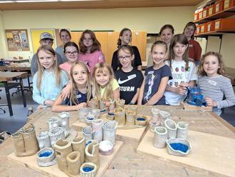 Am Dienstag, den 01.08.2023 fand der begehrte Töpfer-Kurs im Werkraum der Grundschule Gessertshausen statt. Das Töpfer-Team hatte sich für dieses Jahr überlegt, Stiftehalter für den Schreibtisch mit uns herzustellen. Als erstes durften wir zwischen den Tonfarben weiß und rot auswählen. Ingrid Rigg hat uns mit ihren zwei Helferinnen Miriam und Madlen nun alles erklärt und vorgezeigt, dann haben wir den Ton ausgerollt und zu Rollen zusammengesetzt. Nachdem jeder mehrere Rollen hergestellt hatte, haben wir alle miteinander verbunden. Zur Verzierung konnten wir nun die Stiftehalter mit Glasur bemalen oder mit Glasstückchen befüllen. Diese Glasstückchen schmelzen beim Brennvorgang und bilden eine glatte Oberfläche nach dem Erkalten. Alle 12 Mädchen und Jungen hatten Spaß dabei und am Ende einen schönen Stiftehalter. Vielen Dank an Ingrid, Miriam und Madlen! Hoffentlich bieten sie den Kurs noch lange an.