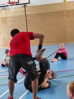 Heute haben wir einiges über Hip Hop und Breakdance erfahren. Als erstes hat uns Roman Breakdance erklärt und mit uns eine Schrittfolge eingeübt. Danach haben wir uns alle auf den Rücken gelegt und Roman hat einen nach dem anderen 'angeschubst' damit wir uns auf dem Rücken drehen. Nach einer kurzen Trinkpause ging es weiter mit Hip Hop - auch hier haben wir viel gelernt. Bei einem Tanzschritt mussten wir mit einer Hand einen Fuß berühren und den anderen Fuß durch die entstandene Öffnung strecken....das war gar nicht so einfach. Roman hat uns auch erklärt, dass gesunde Ernährung und viel Trinken fürs Tanzen wichtig sind, um fit zu bleiben.