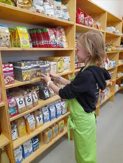 Zu Beginn haben wir uns Schürzen mit unseren Namen darauf angezogen. Als nächstes haben wir verschiedene Aufgaben gelöst. Wir mussten zum Beispiel herausfinden, wie viele verschiedene Obstsorten es im Laden gibt (21), wie viel Gemüsesorten verkauft werden und wir durften Lebensmittel einräumen.