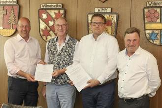 Ein Meilenstein für die Staudenbahn in Fischach: Der Landkreis Augsburg und die Stadtwerke Ulm/Neu-Ulm haben ihre Kooperationsvereinbarung finalisiert. Darüber freuen sich (von links) Landrat Martin Sailer, der Vorsitzende des Staudenbahn-Schienenweg-Trägervereins Josef Böck, der Geschäftsführer der SWU Verkehr GmbH Ralf Gummersbach und Werner Ziegelmeier, Geschäftsführer SWU mobil GmbH.
