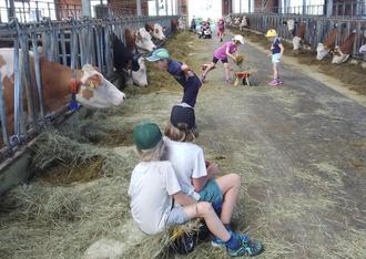 Meine Gruppe ging zuerst zu den süßen Kälbchen, die wir auch gleich streicheln durften. Danach ging es weiter zu den Kalbinnen und Kühen. Papa erklärte den Kindern, was die Kühe fressen und trinken. Aber auch, warum manche Kühe braun, grau oder schwarz-weiß sind.
