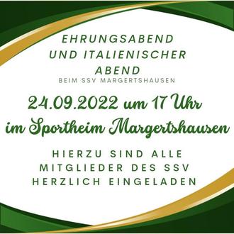 Am Samstag, 24.09.2022 findet ab 17:00 Uhr der Ehrungsabend beim SSV Margertshausen statt. Direkt im Anschluss kann beim italienischen Abend weiter gefeiert werden. Die Mitglieder des SSV sind dazu recht herzlich eingeladen.