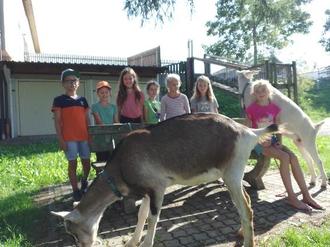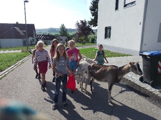 Wir gingen mit unseren Ziegen Schnucki und Heidi einen Rundweg von Wollishausen nach Dietkirch und wieder zurück. Dabei konnten unsere Besucher sehen, wie verfressen Ziegen sind. An jedem Busch und an jeder Wiese mussten ein paar Grashalme gefressen werden. Schnucki und Heidi können aber auch ganz schön schnell sein, das zeigten wir den anderen Kindern, indem wir ein kleines Wettrennen mit ihnen machten. Zum Schluss kamen wir noch an dem Spielplatz in Wollishausen vorbei. Dort machten wir Brotzeit und konnten noch ein bisschen spielen.