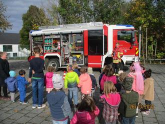 In den einzelnen Kindergartengruppen wurde eine Woche lang besprochen, wie man sich bei einem Brand verhält, wie die Feuerwehr gerufen werden kann und welche Aufgaben die Feuerwehr zu erfüllen hat.