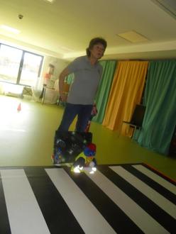 Los ging es mit einem gemeinsam gesungen ADACUS-Lied. Danach erklärte die Moderatorin das richtige Verhalten im Straßenverkehr. Anschließend fanden interaktive Übungen statt, das hieß, die Kinder durften im Schlafraum eine extra dafür aufgebaute Straße überqueren, die Ampel richtig bedienen und lernten, wie sie am Zebrastreifen agieren müssen.