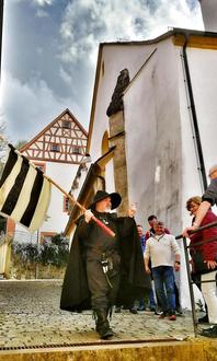 Bei besten Wetter führte der Stadtherold von Pottenstein am Sonntag, 23. April zum Tag des deutschen Bieres durch das romantische Felsenstädtchen. Bei diesem Stadtrundgang erfuhr man viel Wissenswertes über Pottenstein, Lustiges und natürlich auch Interessantes über das Thema Bier. Der Stadtherold verstand es auf Anhieb, die Gäste zu fesseln und integrierte sie kurzerhand in seine Führung mit ein. Es wurde zum Beispiel eine "Elisabeth" gefunden, der das Volk (Gäste) huldigte. Gespickt mit lustigen Aussagen und Sprüchen fand der Rundgang einen geselligen Abschluss bei Bier und anderen Getränken, Schmalz-und Butterbroten im urigen Gewölbekeller der Kellerschänke. Alle 13 Teilnehmer waren sich einig, dass man einen Sonntag nicht besser hätte verbringen können. Der Förderverein bedankt sich ganz herzlich beim Stadtherold von Pottenstein, Gästeführer Thomas Büttner, für die tolle Führung, welche er für den Förderverein Bergwachtbereitschaft Forchheim e.V. gespendet hat.