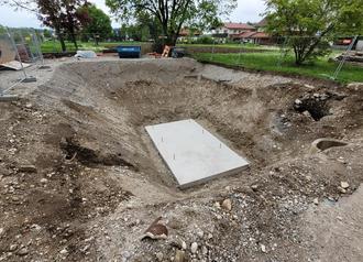Voll im Zeitplan liegt man mit den Sanierungsarbeiten am denkmalgeschützten alten Schulhaus in Erlstätt. Nach verschiedenen Rohbau- und Sicherungsarbeiten werden im Außenbereich nun gerade die Vorbereitungen für den Einbau des Pellettanks getroffen. Auf dem Bild ist Grube mit der vorbereiteten Bodenplatte zu sehen, auf dem der Tank gegründet und später wieder überdeckt wird.