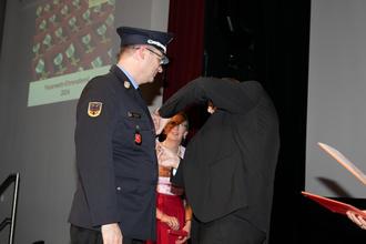 Holger Hübner (rechts) bei der Verleihung des Feuerwehr-Ehrenzeichens in Gold.
