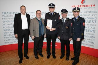 Ehrung für 40 Jahre aktiven Dienst (v. l. ..., 1. Bürgermeister Gemeinde Grabenstätt Gerhard Wirnshofer, Holger Hübner, 1. Kommandant Feuerwehr Grabenstätt Sven Lein u. Kreisbrandrat Christof Grundner)