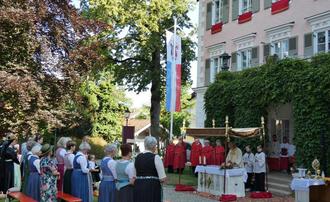 Einen feierlichen Gottesdienst gab es an Fronleichnam im Grabenstätter Schlosspark. Zahlreiche Gläubige hatten sich dazu vor dem malerischen Schloss eingefunden.