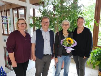 Die Aufnahme zeigt Frau Rita Durchholz (Bildmitte) mit der Leiterin der Mittagsbetreuung, Frau Monika Willeitner (linke Bildseite) sowie den Ersten Bürgermeister Gerhard Wirnshofer und die Personalratsvorsitzende, Frau Ilse Rönsch.