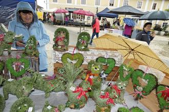Ein Blickfang waren die liebevoll gestickten, gestrickten und genähten Sachen von Gerlinde und Simone Daxenberger und die Heutiere von Veronika Parzinger. Sie waren gut damit beschäftigt, ihre Produkte trocken zu halten, denn die (zweckentfremdeten) gemeindlichen Sonnenschirme erwiesen sich als nur bedingt wasserdicht. Ausgefallen ist leider die traditionsreiche Kräuterwanderung mit dem Schlechinger „Kräuterpapst“ Fritz Irlacher, der als Vater des Ökomodells Achental kurz dessen rund 25-jährige Erfolgsgeschichte vorstellte. Um die Idee des ökologischen Wirtschaftens mit Leben zu erfüllen und eine umweltverträgliche und zukunftsorientierte Entwicklung der Region zu fördern, haben sich einst Gemeinden aus dem Achental zusammengeschlossen. Auch Grabenstätt ist Mitglied. Das Ökomodell und mit ihm die ganze Region würden bis heute immer wieder wertvolle Bereicherungen erfahren, so Irlacher. Mit ihren schmackhaften Kuchen und Kaffee verköstigten die Grabenstätter und Erlstätter Bäuerinnen ihre Gäste. „Einige Leute haben nur kurz vorbeigeschaut, haben sich einen Kuchen einpacken lassen und waren wieder weg“, so Ortsbäuerin Angelika Huber. Ein Anziehungspunkt für die jüngsten Besucher war das erstmals angebotene Kinderschminken. Für die musikalische Umrahmung sorgten Katharina (Harfe) und Markus Gromes (Ziach).