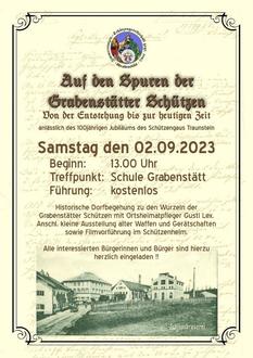 anlässlich des 100jährigen Bestehens des Schützengaus Traunstein, findet unter diesem Motto am Samstag den 2. September 2023 eine Historische Dorfbegehung zu den Wurzeln der Grabenstätter Schützen mit Ortsheimatpfleger Gustl Lex statt.