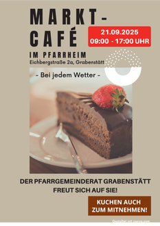 Am Sonntag, 21.09.2025 findet das Marktcafé von 09:00 bis 17:00 Uhr statt. Sie finden uns bei jedem Wetter im Pfarrheim, Eichbergstraße 2a. Kommen Sie vorbei! Der Pfarrgemeinderat freut sich darauf, Ihnen köstliche, selbstgebackene Kuchen & Kaffee anzubieten.