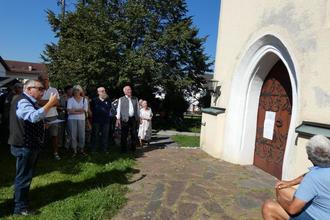 Am Sonntag, den 10.09.2023, drehte sich in Grabenstätt nicht alles um den großen Herbstmarkt mit Flohmarkt, sondern es wurde auch der Tag des offenen Denkmals begangen. Im Fokus stand dabei die St. Johanneskirche in der Ortsmitte, zu deren facettenreicher Geschichte Ortsheimatpfleger Gustl Lex einiges zu erzählen hatte. Als Taufkapelle erbaut und Johannes dem Täufer geweiht, gehöre sie zu den ältesten Gotteshäusern und frühesten Wahrzeichen christlicher Gemeinschaft im Chiemgau, so Lex. Wechselvolle Schicksale, Umbau und Erweiterungen überstand das bescheidene Gotteshaus, dessen Turm sich Jahrhunderte lang im Chiemsee spiegelte. Das Seewasser reichte nämlich bis Ende des 18. Jahrhunderts bis an die heutige Ortsmitte heran, sodass sich Grabenstätt einst zum größten Fischerdorf am Chiemsee entwickeln konnte. Die vor rund 1150 Jahren erbaute, ursprünglich romanische Johanneskirche entstand in ihrer heutigen Form Mitte des 14. Jahrhunderts. Vielen Generationen diente sie als Pfarrkirche, bis zu Beginn des 15. Jahrhunderts die neue und größere Maximilianskirche diese Aufgabe übernahm, neben der sie fortan als Nebenkirche und Beneficium fungierte und bis heute im Dienst aller Christgläubigen steht. Im 19. Jahrhundert schien innerhalb einer einzigen Generation das Ende des Chiemgauer Kleinods gleich zweimal besiegelt zu sein, da die verheerenden Dorfbrände von 1834 und 1862 nahezu den gesamten Ort, so auch St. Johannes, in Asche legten. „Aber die vielgeprüften Pfarrkinder“, schreibt der Chronist, hätten ihre Johanneskirche „nicht dem Verfall überlassen“. Ganz im Gegenteil: Wiederhergestellt und renoviert, feierte man 1870 ihr 1000-jähriges Bestehen. Von Lex nicht unerwähnt blieben auch die 1967 bei Renovierungsarbeiten unter dem alten Farbanstrich entdeckten Fresken, die das Gotteshaus zu einem kulturhistorisch bedeutsamen Zeitzeugnis des späten Mittelalters machen. Ein sechs Meter hoher Christopherus, der im Chiemsee watet, füllt die zweite Jochwand der Nordseite und zog auch die Teilnehmer der Führungen in seinen Bann. Die folgenden Wandabschnitte beinhalten Bilder der Heiligen und bildhafte Erzählungen aus deren Leben, die der damaligen, meist des Lesens unkundigen Bevölkerung zur Belehrung und Erbauung dienten. Auch die Stifter, die Winkler Hofmarksfamilie Hans und Anna Auer, sieht man mit ihren vier Kindern abgebildet. Hans Auer, dessen Tochter Magdalena Äbtissin des Klosters Frauenchiemsee wurde, starb früh. Seine trauernde Witwe Anna beauftragte den Meister Jeromin Wulfiger aus Burghausen zur Ausmalung der Kirche. Wahrscheinlich sind die zwischen 1470 bis 1480 entstandenen Fresken bei der Renovierung in der Barockzeit um 1660 übertüncht worden. Lex verwies im Beisein von Kreisheimatpfleger Dr. Christian Soika auch auf den alten Römerstein, der über dem Eingangsportal der St. Johanneskirche verbaut ist.