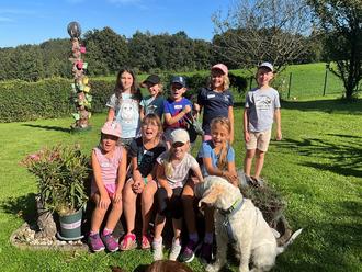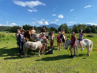 Sehr beliebt ist jedes Jahr die Veranstaltung „ Ausflug in die kleine Welt der Pferde“. Veranstalterin Bela Geutner schreibt dazu: „Wir starteten bei dem schon extrem heißen Wetter mit einem ganz anderen Programm als geplant. Zuerst schauten wir mal wie die Knotenhalfter am Pferd angelegt werden. Als alle soweit waren, konnten beim Putzen die vielen verschiedenen Bürsten ausprobiert werden. Nach einiger Zeit ging’s auf unsere Pferdspielwiese. Dort lernten wir ein paar Spielchen mit dem Stick und stellten fest das es gar nicht so einfach ist das zu koordinieren. Dann ging’s noch ein paar Runden führend mit den Pferden über die Wiese. Nach dem Laufen machten wir Pause unter dem Apfelbaum. Motiviert ging’s danach aufs Pferd und konnten mit Spicker auf Luftballons schiessen. Nach vielen Treffern war der schöne Nachmittag vorbei und möchte mich noch bei meinen fleißigen Helfern ganz herzlichen bedanken!“