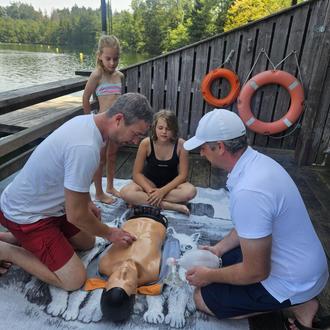 Jugendleiter Patrick Probst (rechts) und Philipp Probst gaben im Rahmen des Grabenstätter Kinderferienprogramms spannende Einblicke in die Arbeit der Wasserwacht Grabenstätt-Tüttensee. Den Kindern wurden diverse Ausrüstungsgegenstände und Rettungsmittel vorgestellt. Auch die wichtigsten Baderegeln besprach man. Großen Einsatz zeigten die Kinder beim Rudern, Tauchen und Üben von Wiederbelebungsmaßnahmen (Bild).
