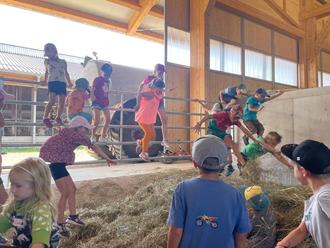 Die Teilnahme an dieser Kinderferienprogramms-Veranstaltung war die Voraussetzung dafür, um zwei Wochen später an der Fahrt zu den Berchtesgadener Milchwerken in Piding teilnehmen zu dürfen. Viele Bauern aus Grabenstätt und Umgebung liefern ihre Milch zu den Berchtesgadener Milchwerken. Bäuerin Christa Berger begrüßte die Ferienprogrammskinder und erklärte ihnen den „Speiseplan“ der Kühe: Grundfuttermittel, Heu, Grassilage, Maissilage, Stroh sowie Kraftfuttermittel wie Getreide, Körnermais, Rapsschrot. Die Kühe bekommen eine Mischration aus diesen verschiedenen Bestandteilen. Die Kinder durften auch beim Futtermischen zuschauen. Christa Berger verglich das Futtermischen mit dem Kochen eines Menüs im Thermomix. Wie gelingt es den Kühen, Gras in gute Milch umzuwandeln und was bedeutet nachhaltige Milchproduktion in der Grünlandregion Chiemgau? Start des Rundgangs bei den Kälbern. Kälber einfüttern und einstreuen. Dann wurde geklettert und ins Einstreu gesprungen inklusive Heuschlacht.