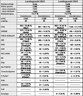 In der letzten Ausgabe des Grabenstätter Gemeindeanzeigers wurden die Gemeindeergebnisse der zurückliegenden Landtags- und Bezirkswahl veröffentlicht. Leider wurden die Zahlen der gültigen Erst- und Zweitstimmen für die Landtagswahl sowie die Bezirkswahl in die Zeile der ungültigen Stimmen eingetragen. Umgekehrt erfolgte die Eingabe der ungültigen Erst- und Zweitstimmen in der Zeile für die gültigen Stimmen. Wir bitten um Kenntnisnahme und stellen hier die korrigierten Tabellen zur Verfügung: