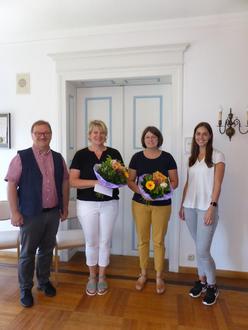 Bürgermeister Gerhard Wirnshofer machte sich auf den Weg zur KiTa und gratulierte den beiden Damen recht herzlich. Auch die Kolleginnen und Kollegen aus der Verwaltung überbrachten ihre Glückwünsche. Von links: Kindergartenleiterin Petra Körner, Personalratsvorsitzende Ilse Rönsch, Ramona Lutz, Carmen Schlegel und Erster Bürgermeister Gerhard Wirnshofer