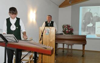 Der Grabenstätter Ortsheimatpfleger Gust Lex bei seinem Vortrag „Gefangen in Grabenstätt – Schicksal des Kriegs“. Im Vordergrund ist Zitherspieler Andreas Lex zu sehen, der Enkel von Gustl Lex. Zusammen begeisterten sie die rund 100 Besucher in der Schlossökonomie. Der Heimat- und Geschichtsverein Achental hatte den Abend veranstaltet.