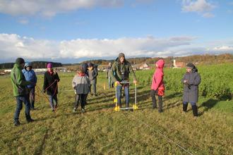 Erklärt wurde auch die Geoelektrische Widerstandskartierung, die nachmittags auf den Maueräckern bei Erlstätt praktisch erprobt wurde sowie die geoelektrische Tomographie, die 2D-Profilschnitte durch das Erdreich sichtbar macht.