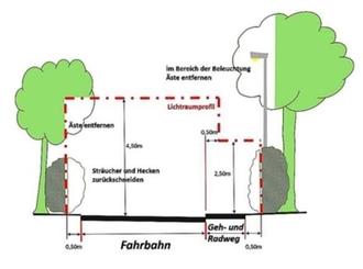 Die Anpflanzungen müssen so weit entfernt werden, dass die Verkehrszeichen, Straßenbeleuchtungen, der Lichtraum entlang und über der Straße bzw. Geh- und Radwegen sowie das Sichtfeld an Einmündungen und Kreuzungen vom angrenzenden Bewuchs freigehalten werden. Die Höhe des erforderlichen Lichtraums bei Geh- und Radwegen beträgt 2,50 m, bei Straßen hingegen 4,50 m. Im Sichtdreiecken von Straßenkreuzungen und – einmündungen darf die Bepflanzung eine Höhe von 0,80 m nicht überschreiten.