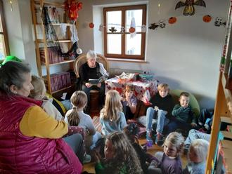 Am Tag vor Halloween kamen zahlreiche erwartungsvolle Kinder zur groß angekündigten Gruselgeschichte „Der kleine Drache Kokosnuss im Spukschloss“ in die Grabenstätter Pfarr- und Gemeindebücherei. Bei langsam einbrechender Dunkelheit präsentierte sich diese am späten Nachmittag passend dekoriert mit Lichterketten, leuchtenden Kürbissen, schwebenden Kerzen und Geistern. Bevor aber das Buch zum Vorlesen aufgeschlagen wurde, sind erst einmal die Dosen mit den selbst gebackenen Fledermäusen und Dinos geöffnet worden. Schließlich braucht man ja zum konzentrierten Zuhören viel Energie. Entsprechend aufmerksam lauschten die Kinder anschließend der Vorleserin Margie Lanzinger. In der folgenden Pause, in der es wieder leckere Plätzchen gab, konnten sie den zweiten Teil des Buches kaum erwarten. Mit Recht, denn es wurde noch einmal richtig spannend und gruselig. Aber natürlich kam auch der Spaß nicht zu kurz. Die Kinder waren voll dabei und hingen förmlich an den Lippen von Frau Lanzinger. Alle Beteiligten, auch die begleitenden Eltern, waren sich einig, dass es ein wunderschöner, unvergesslicher Nachmittag war, der Lust auf mehr machte. „Machen wir das mal wieder?“, fragten die begeisterten jungen Zuhörer.