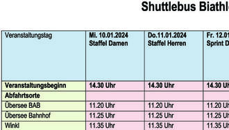 Auch 2024 wird es wieder einen Shuttlebus zum Biathlon-Weltcup nach Ruhpolding geben – und somit die Möglichkeit, bequem und ohne Umsteigen von den Haltestellen am Marktplatz Grabenstätt oder in Winkl direkt zur Chiemgau Arena (und zurück) zu gelangen. Die Fahrkarten sind ab sofort in der Tourist-Information und über www.ticketscharf.de erhältlich. Bitte weisen Sie Ihre Gäste auf den Shuttlebus hin – nur, wenn er gut genutzt wird, kann es dieses Angebot auch zukünftig geben.