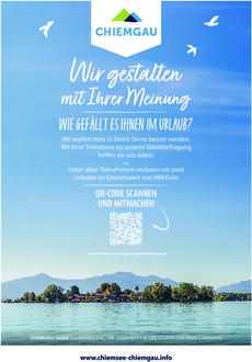 Zur Gästebefragung gelangt man über den link www.chiemsee-chiemgau.info/gaestebefragung oder nebenstehenden QR-Code.
