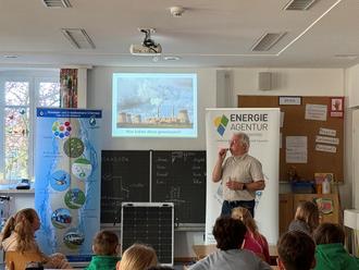Gerhard Marx von der Energieagentur Südostbayern klärt die Schülerinnen und Schüler der dritten Klasse in Breitbrunn zu den Themen „Energie und Klimaschutz“ auf.