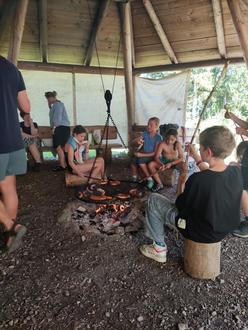 hieß es: Ärmel hochkrempeln! Gemeinsam wurde Feuerholz gehackt und das Lagerfeuer selbst entfacht – gar nicht so leicht, aber mit Teamwork klappte es schließlich. Nacherfrischenden Abkühlung im Bach konnten sich die Kinder am Lagerfeuerplatz aufwärmen und am knisternden Feuer grillten die Kinder ihre Würstl, dazu gab es knuspriges Stockbrot und Brezen.